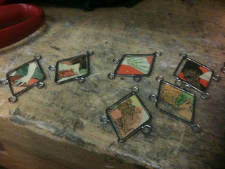 These started out as some metal circles which amazingly enough i was able to solder in one go with no swearing..( maybe there is something to this whole practice thing..whatever) then i used so vintagy reproduction post cards, cut to fit then pour resin. voila.
